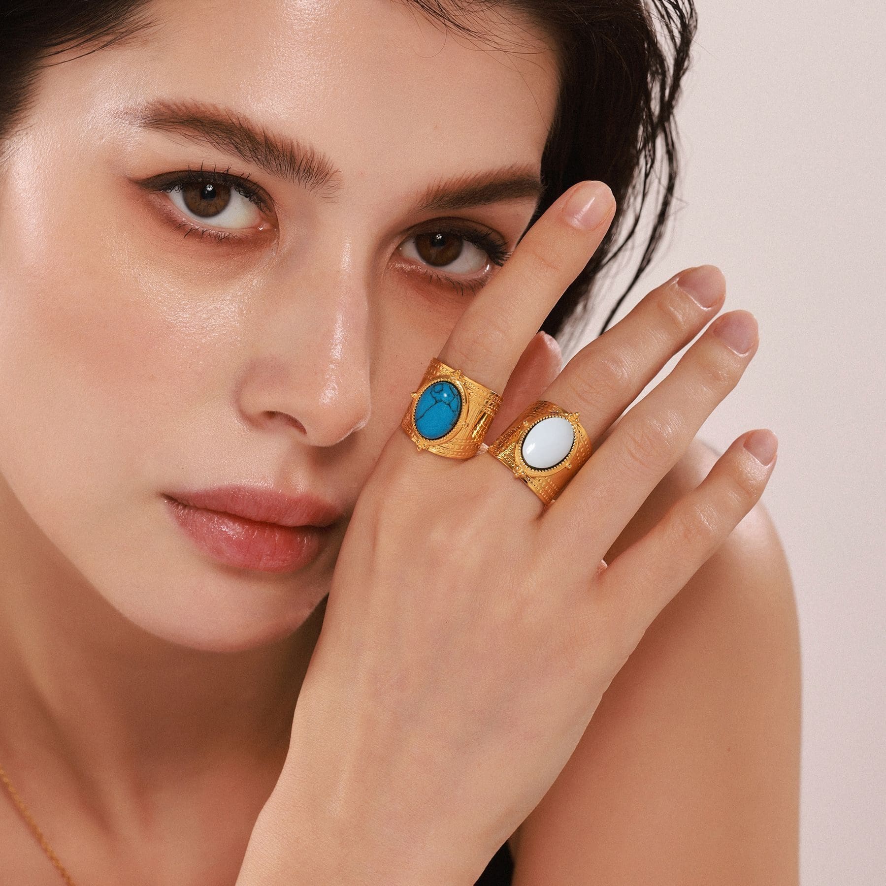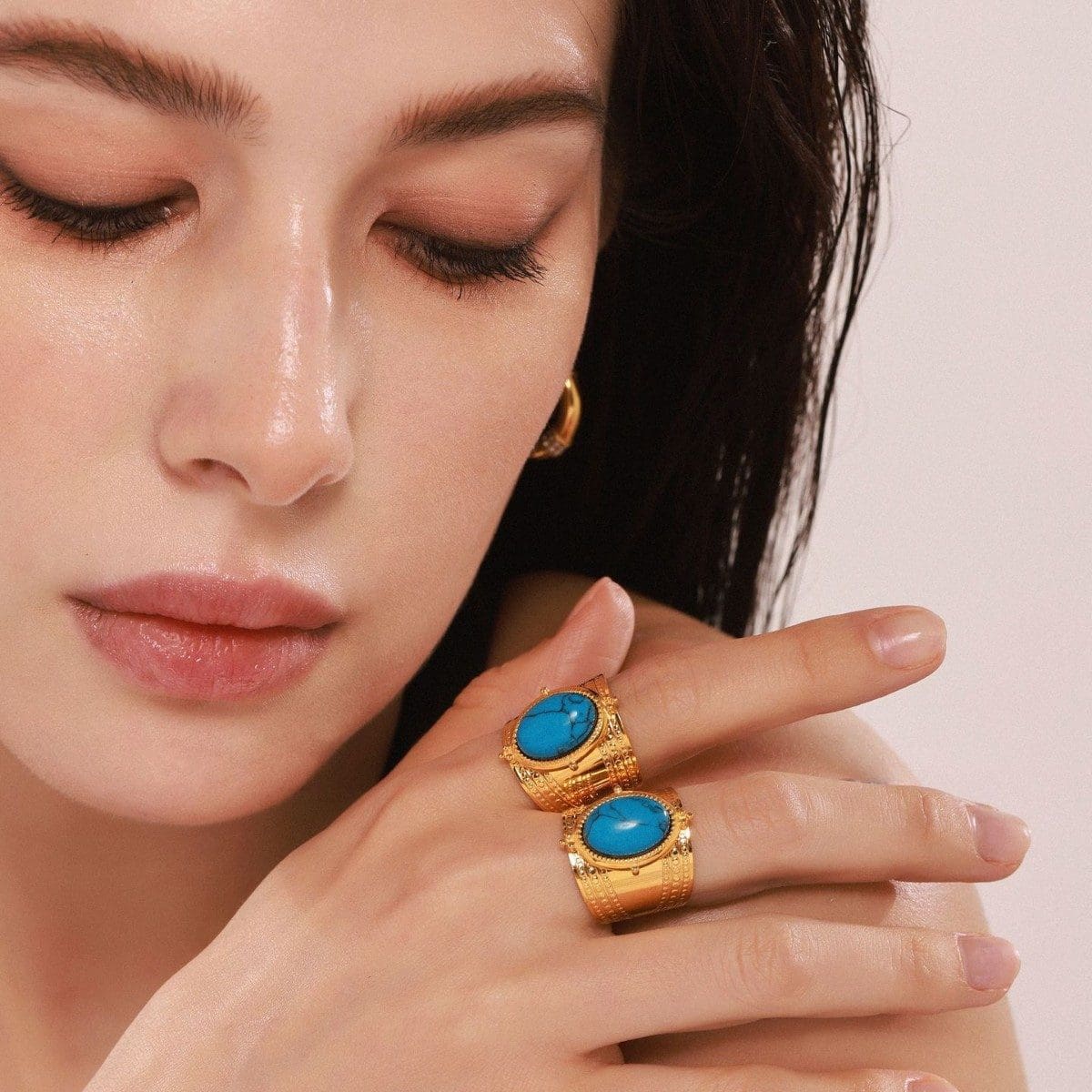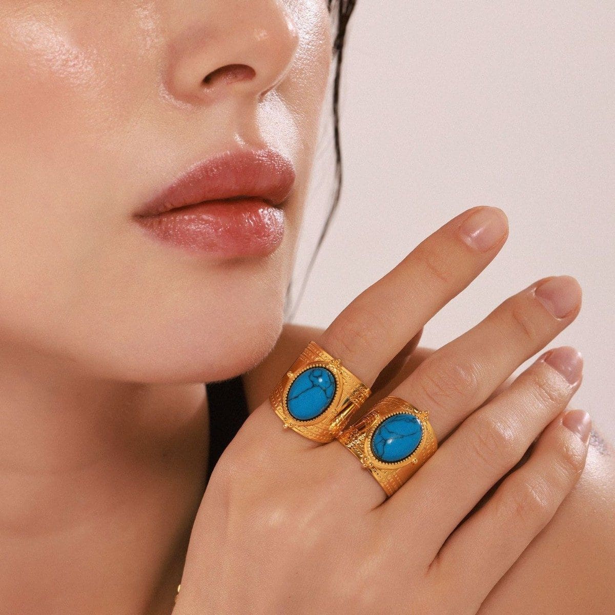 טבעת רחבה כ-22 מ"מ עם אבן טורקיז כחולה גדולה ומרשימה. הטבעת עשויה מסטיינלס סטיל בציפוי זהב אמיתי 18K בטכנולוגית PVD, טבעת פתוחה הניתנת להתאמת המידה הרצויה.