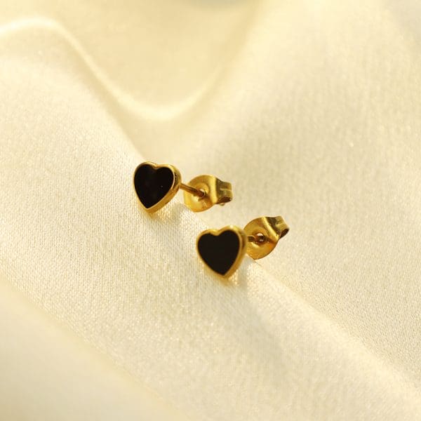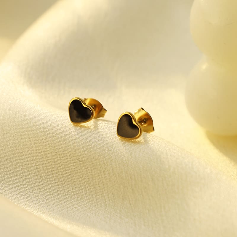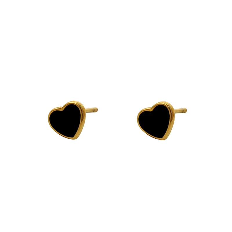 עגילים צמודים סטיינלס סטיל ציפוי זהב אמיתי 18K עם לב מושחר בגודל של כ-6 מ"מ על 6.7 מ"מ.