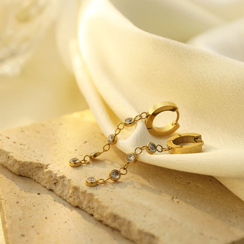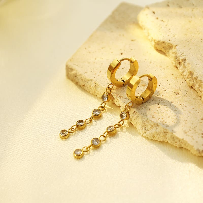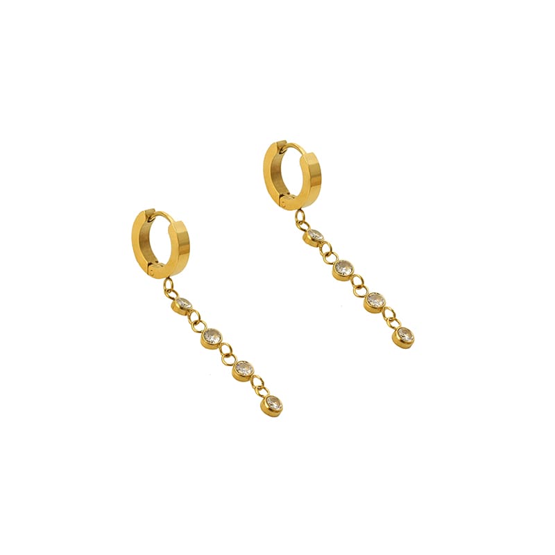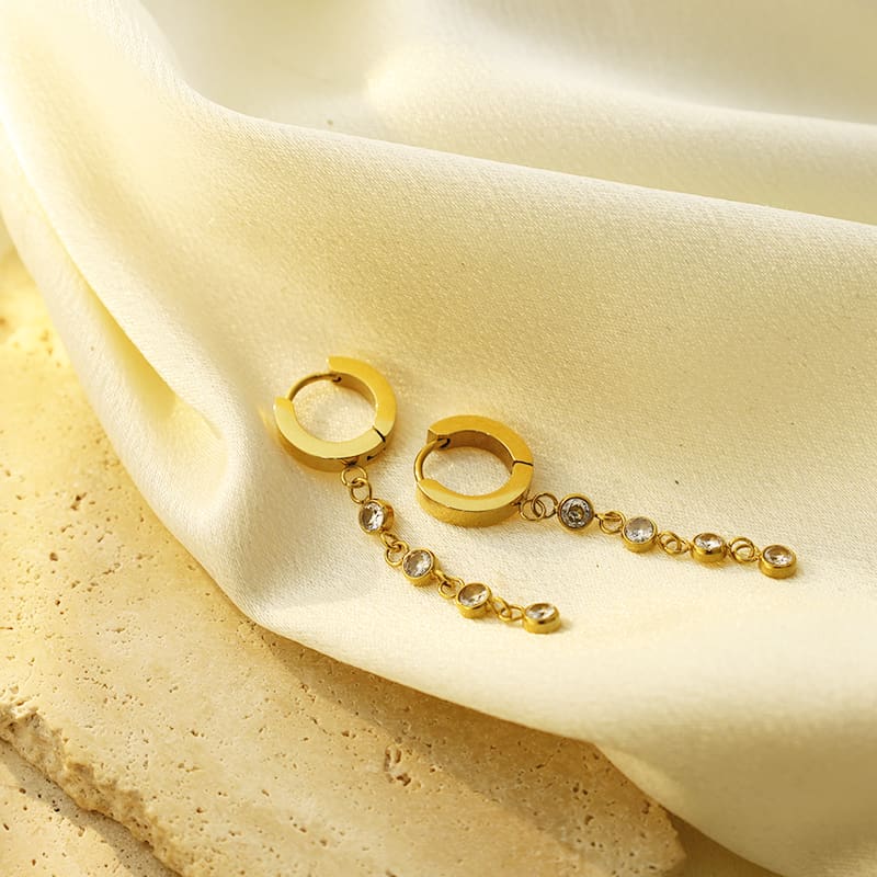 עגילי חישוק עם תליון שורת זרקונים משתלשלים, עיצוב אלגנטי עם נוכחות שמוסיפה תנועה עדינה לכל תסרוקת. מושלמים לערב או ליום שאת רוצה לזרוח. עשויים סטיינלס סטיל בציפוי זהב 18K בטכנולוגיית PVD העמידה והאיכותית ביותר.