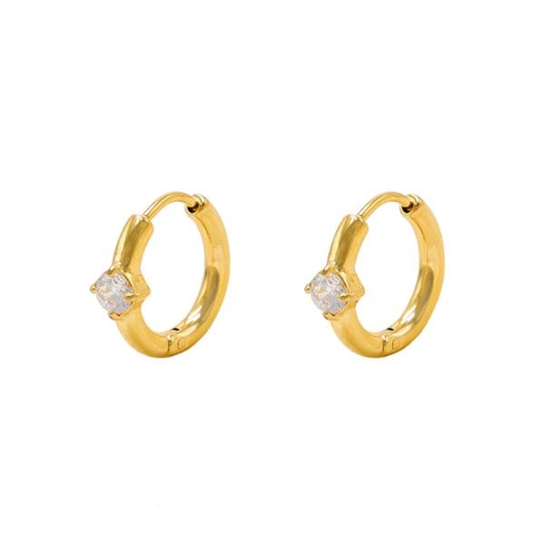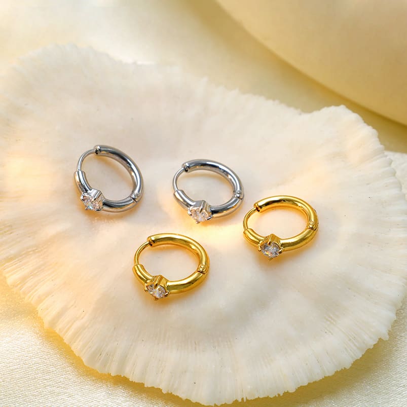 עגילי חישוק סטיינלס סטיל ציפוי זהב אמיתי 18K קוטר החישוק כ-17 מ"מ עם שיבוץ זירקוניה עגולה בקוטר של כ-5 מ"מ.