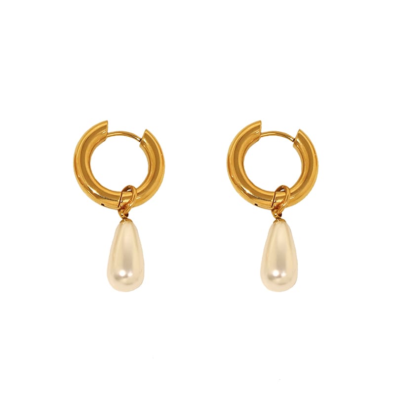 עגילי חישוק עם תליון פנינה בצורת טיפה, שילוב מרשים בין אלגנטיות קלאסית למראה עדכני וייחודי. מתאימים לאירועים וגם ללוק יומיומי נשי ועדין. עשויים סטיינלס סטיל בציפוי זהב 18K בטכנולוגיית PVD האיכותית ביותר. מומלץ לשלב עם שרשרת עדינה או צמיד זהוב.