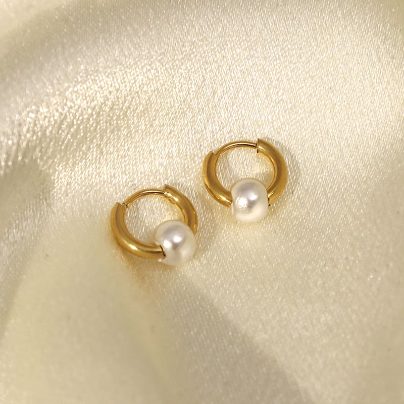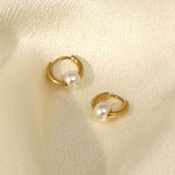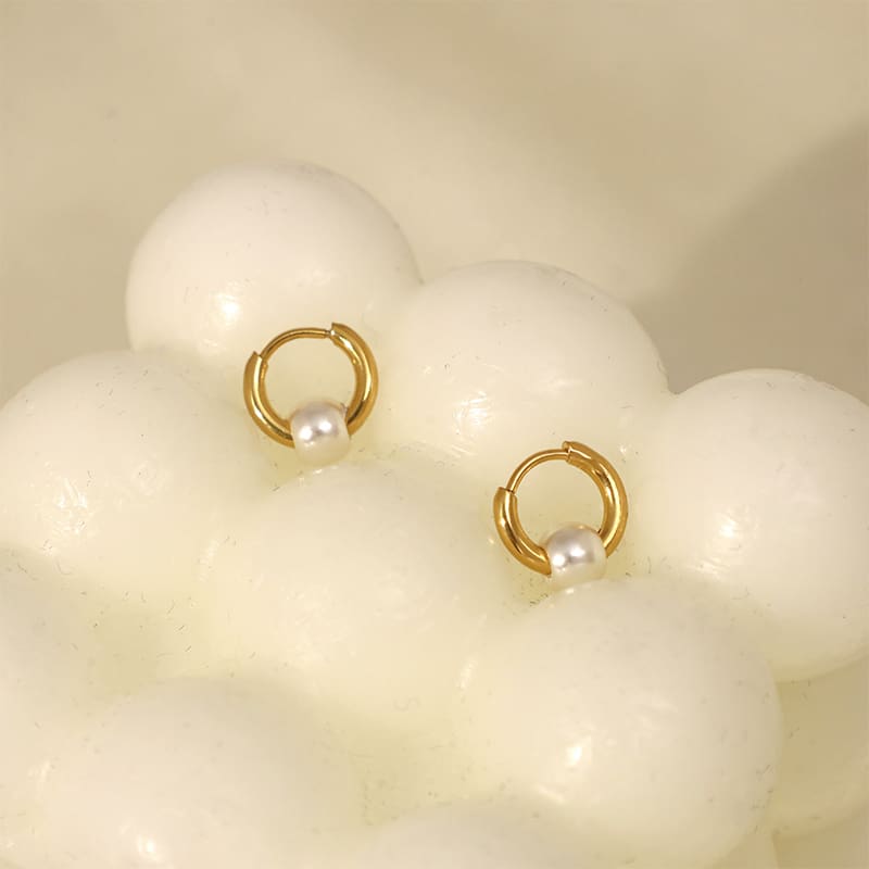 עגילים אלגנטיים ועדינים, בעיצוב חישוק קטן עם חרוז דמוי פנינה לבנה במרכז שילוב שמביא איזון מושלם בין קלאסיות לנוכחות עדכנית.