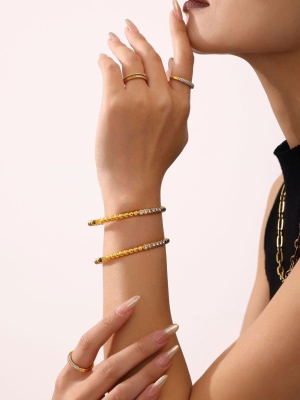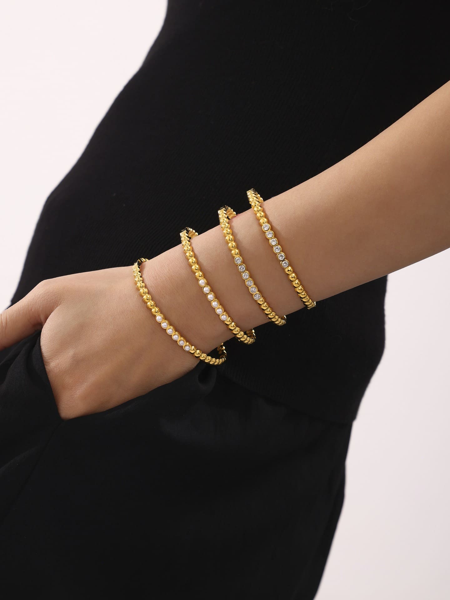 צמיד קשיח בצורת חרוזים בגימור זהב מבריק עם שורת זירקוניה נוצצים בחזית שמוסיפים טאץ' אלגנטי ויוקרתי מתאים לשילוב עם לוקים יומיומיים או לערב מיוחד מעניק מראה מלא נוכחות גם כשנלבש לבד עשוי מסטיינלס סטיל בציפוי זהב 18K בטכנולוגיית PVD לשמירה על הברק והאיכות לאורך שנים.