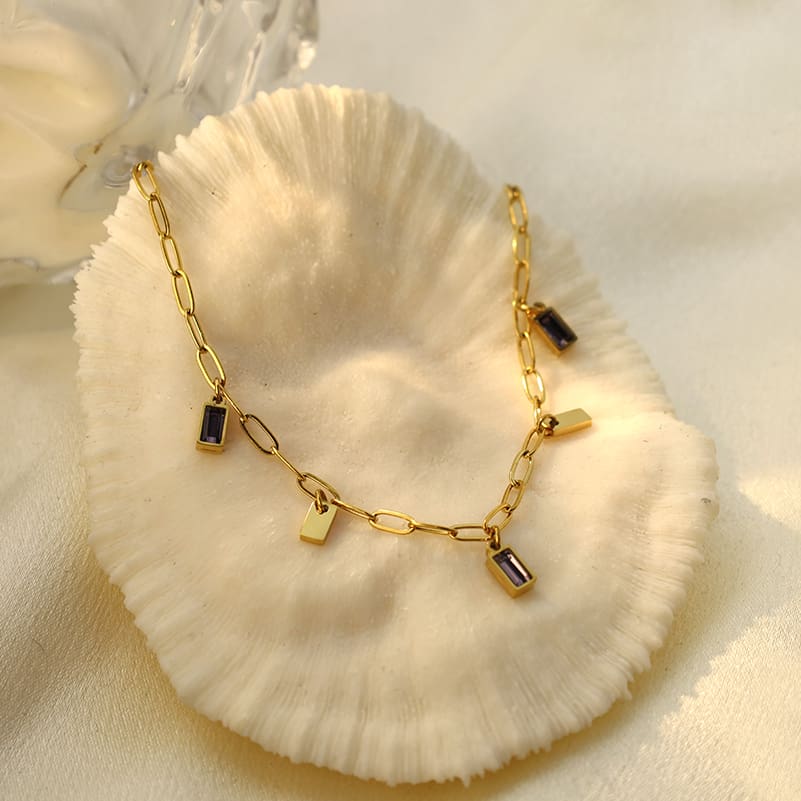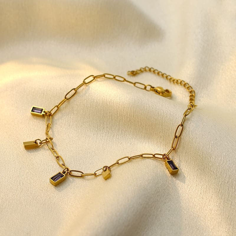 צמיד עדין עם אבני חן בגוון סגלגל ותליונים קטנים, מוסיף צבע עדין ונוכחות מיוחדת לכל לוק. מושלם לשילוב עם שרשרת תואמת וכמובן לבילוי ערב נעים.