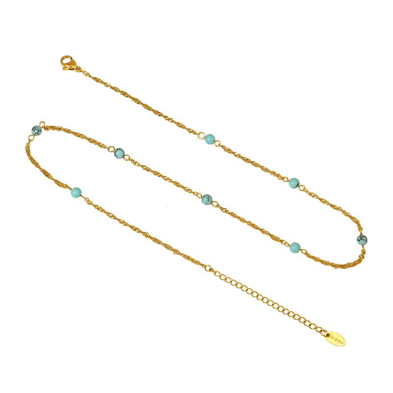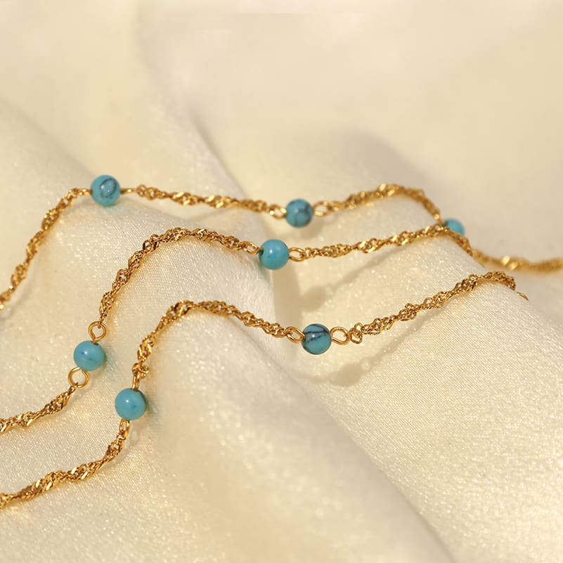 שרשרת עשויה סטיינלס סטיל בציפוי זהב 18K בטכנולוגיית PVD, משובצת חרוזים בגוון טורקיז המזכירים אבני חן טבעיות. העיצוב מעניק תחושת קלילות ורעננות שמתאימה לכל עונה, ומשתלב נפלא בלוקים יומיומיים או לערב אלגנטי. ניתן לשלב עם צמיד תואם להשלמת הלוק.