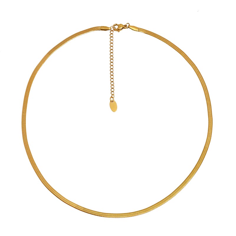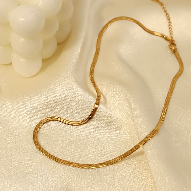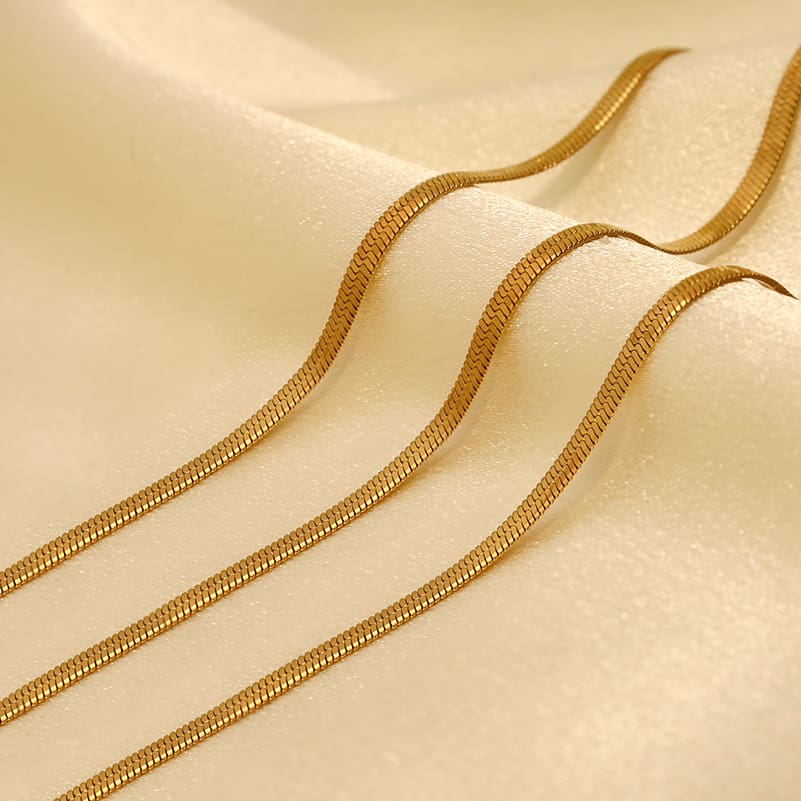 שרשרת שטוחה ומבריקה בעיצוב נחשי מחמיא, עשויה סטיינלס סטיל איכותי בציפוי זהב 18 קראט בשיטת PVD. עמידה למים ולשחיקה. מתאימה לכל לוק יומיומי או ערב קלאסי, מושלמת לשכבות או כפריט בודד.